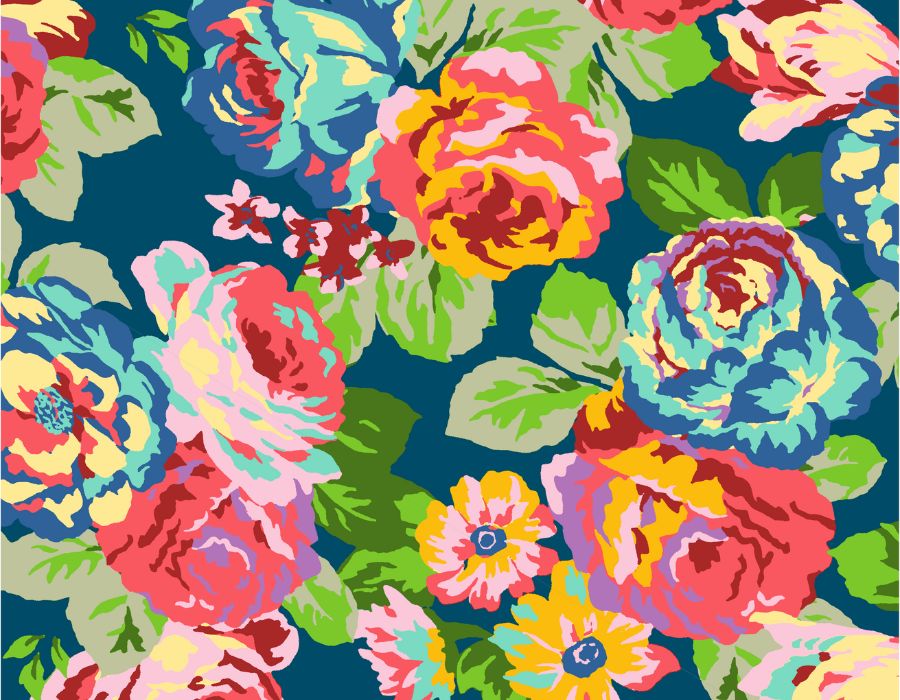 Flowergarden-kuosi syntyi kuvattuani kukkia monine väreineen keväällä Malagan kasvitieteellisessä puutarhassa. Palmut ja eksoottiset kukat toivat värimaailmaksi sekoituksen kevättä, kuumaa ilmaa ja trooppista fiilistä.
