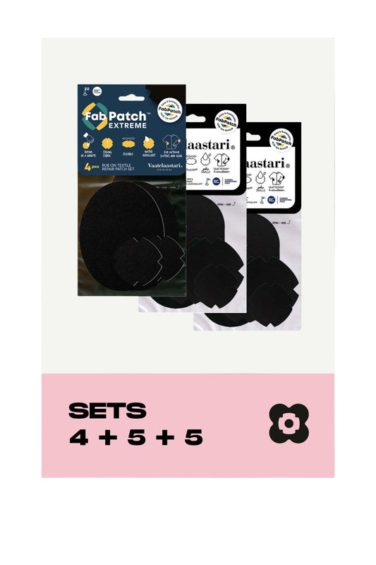 Kokomusta setti sisältää kolme suosittua FabPatch Vaatelaastari® -tuotetta: